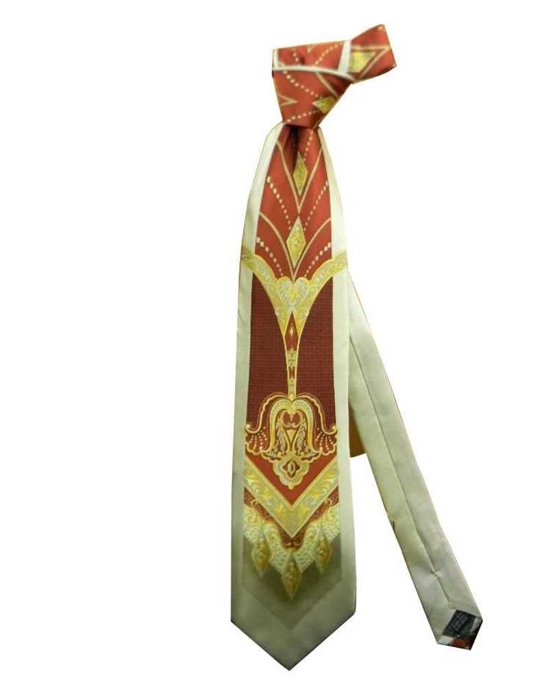 variante 7 cravatta beige panna in seta lucida con disegno marrone ramato rientranti gialli fango oro
