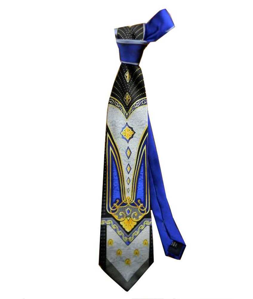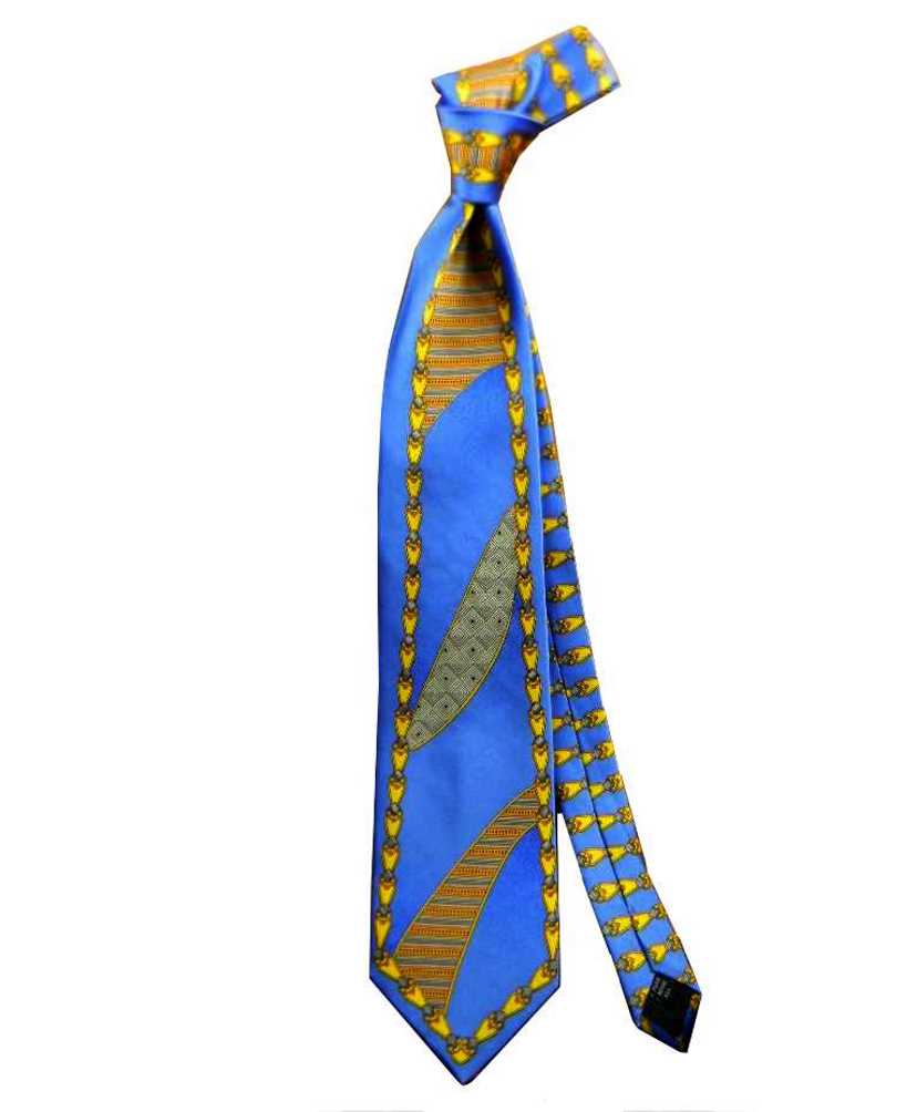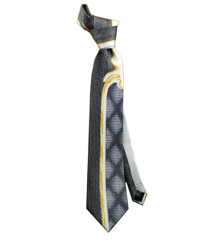 variante 2 Cravatta Particolare prodotta in twill di pura seta stampata, nera con disegno grigio originale e rientranti giallo oro con fondo blu navy;