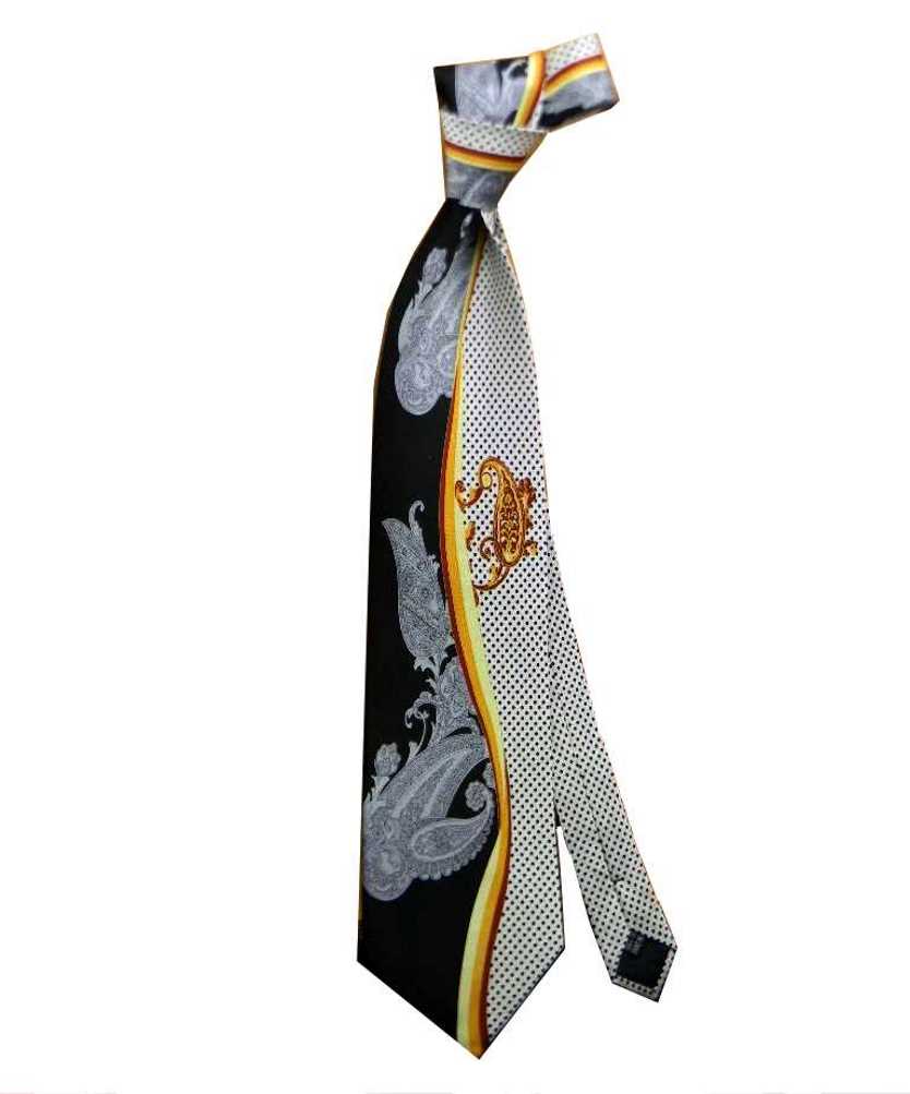 variante 1 cravatta in seta operata fondo nero con motivo cashemire grigio e parte bianca a puntini neri;