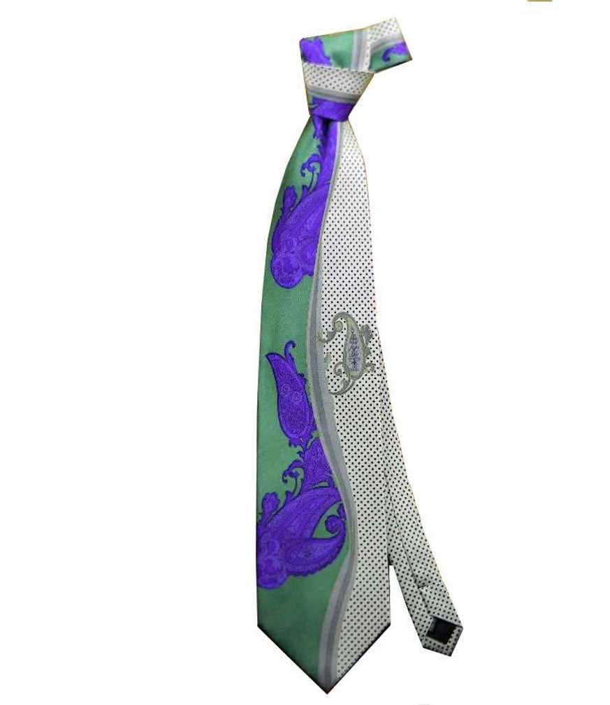 variante 10 cravatta in seta operata verde acido con parte bianca a pois neri piccoli e disegni cashemere viola