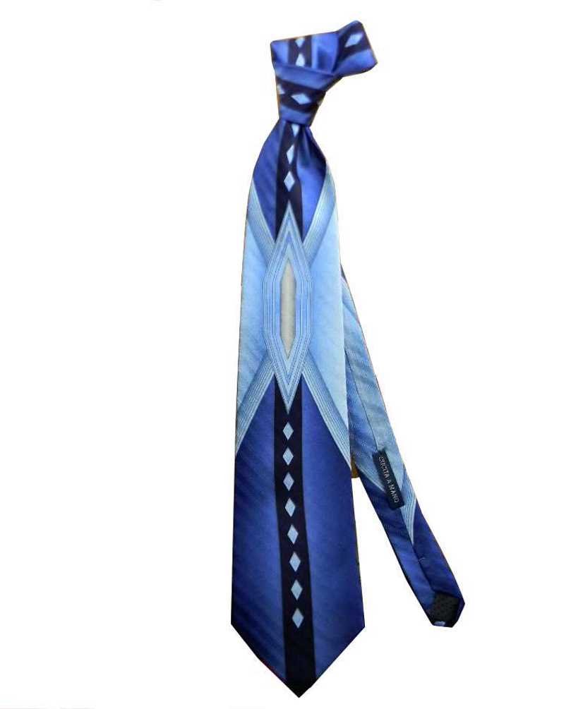 variante 16 cravatta particolare azzurra celeste con riga centrale blu notte disegni geometrici ripetuti con motivo centrale grigio