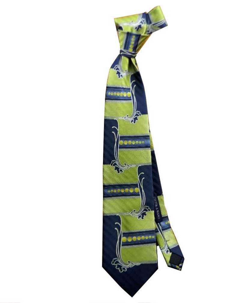 variante 17 cravatta particolare a fantasia verde kiwi in sfumatura con parti blu e motivi a cerchi geometrici gialli oro su seta operata con trama a riga spezzettata