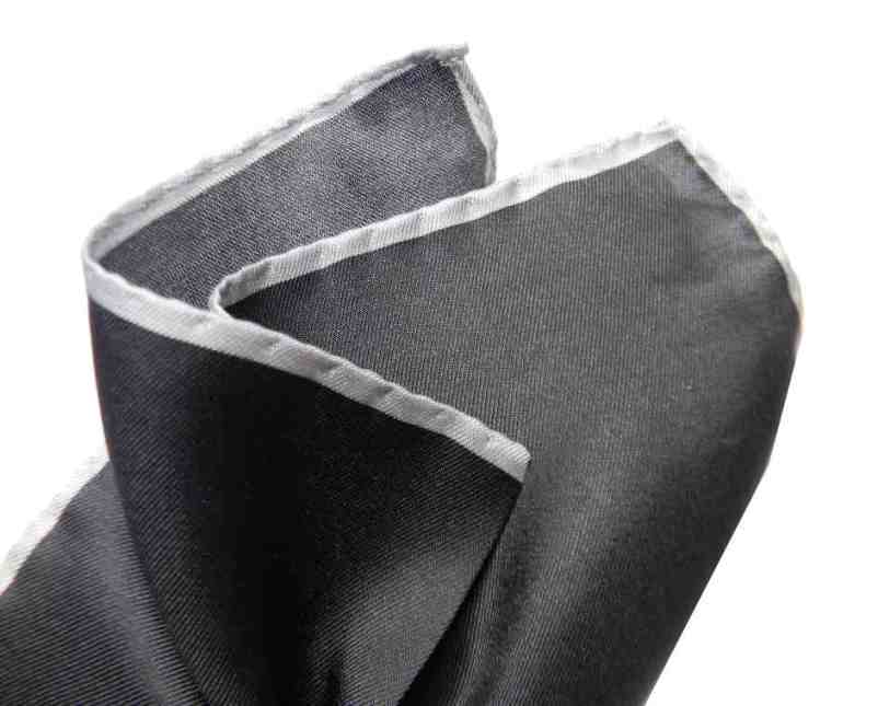 pochette da taschino di seta per uomo fondo nero black, schwarz, noir con bordi in contrasto, disponibili in svariati toni e colorazioni tutti visibili nel nostro store e in inserzione