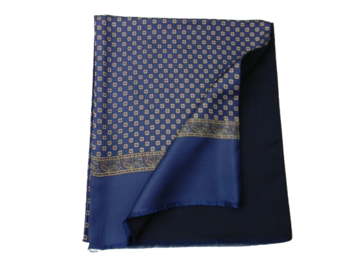 sciarpa doppia lana e seta variante 3 con micro fantasia su fondo blu marino navy a disegno classico a motivi gialli azzurri e rossi interno bianco, balza in tinta a fondo operato