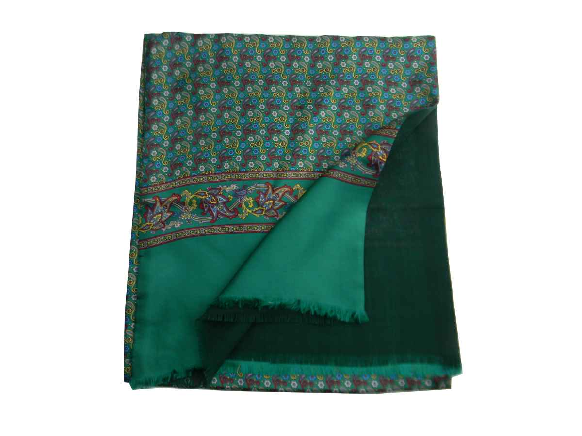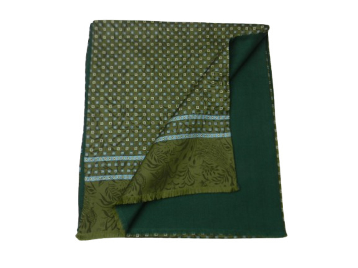 variante 3 verde con motivi beige azzurri aranci in seta a disegno classico su sfondo floreale, doppiata con lana verde unita fine e battuta.